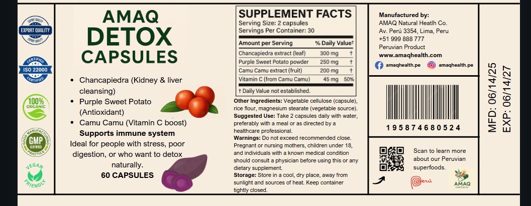 White plastic bottle with 60 plant-based detox capsules made from superfoods native to Peru, priced at $7.80 per bottle (€6.90).